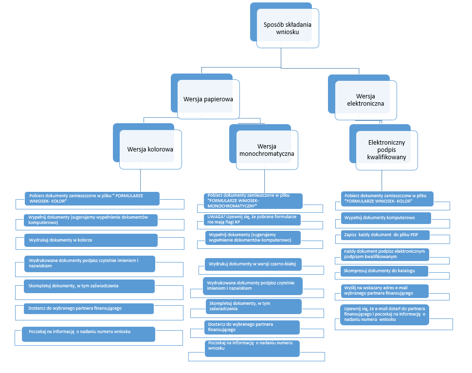 Wniosek w wersji elektronicznej wraz z załącznikami opatrzony elektronicznym podpisem kwalifikowanym należy przesłać na wskazany w wykazie placówek adres mailowy wybranego partnera finansującego.